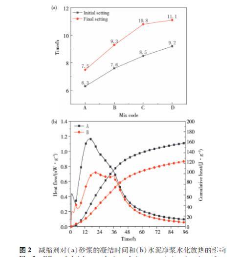 圖2減縮劑對(duì)(a)砂漿的凝結(jié)時(shí)間和(b)水泥凈漿水化放熱的影響
