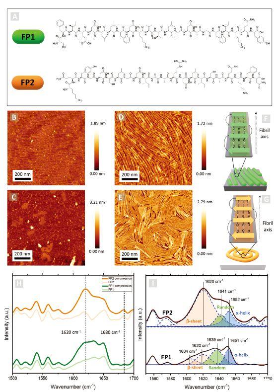 圖2、A)FP1和FP2肽的化學結構。FP1(B和D)和FP2(C和E)肽LB膜的AFM顯微照片分別在無壓縮(B和C)和20 mN m-1(D和E)的情況下轉移到新鮮切割的云母基底上。F,G)導致纖維形成的肽β-折疊二級結構的示意圖。H)在這項工作中研究的樣品的LDIR光譜。I)將酰胺I帶解卷積為其主要成分。