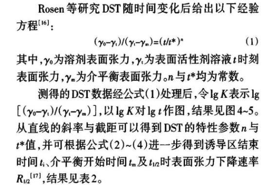 其中,γ0為溶劑表面張力,γt為表面活性劑溶液t時刻表面張力,γm為介平衡表面張力。n與t*均為常數。