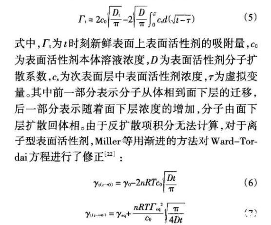 對c<cmc的表面活性劑溶液,Ward和Tordai根據擴散控制機理提出了描述表面吸附動力學的模型: