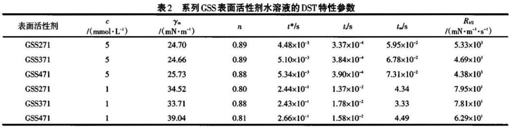 以GSS271為例,濃度越高,表面活性劑分子的擴散推動力越大,于氣液界面吸附越快,DST下降越顯著,因而誘導區結束的時間越早,越易達到介平衡,這與γm、ti、tm較小吻合;t*值隨濃度增大而減小,表明吸附后期勢壘隨濃度增大而增大,因為濃度較高時,更多的GSS271分子吸附于表面,由于空間位阻、分子間靜電斥力的影響,阻礙了新的GSS271分子吸附,吸附勢壘變大。濃度高時,R1/2大,動態表面活性好。