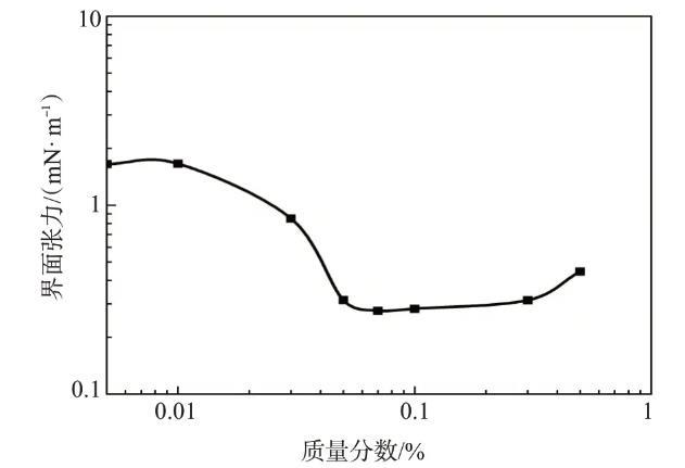 根據吉布斯吸附理論,為了達到超低油/水界面張力,表面活性劑分別與油相和水相發生強的相互作用并且在油水界面達到飽和吸附。這要求表面活性劑同時具有大的親水基和疏水基。不同濃度的表面活性劑TPHS溶液與大慶原油間的界面張力如圖3所示,隨著表面活性劑TPHS質量分數的增大,界面張力先減小后緩慢增大,在較大的濃度范圍內可保持在10-1mN/m數量級。TPHS質量分數為0.07%時,界面張力達到最低,為0.276 mN/m。TPHS具有較好的降低油水界面張力的能力。