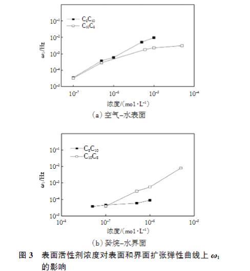 表面活性劑濃度對表面和界面擴張彈性全頻率譜上ω1的影響如圖3所示。
