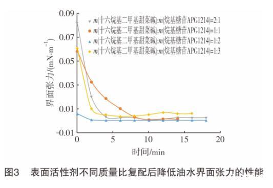 圖3為二者按不同質量比復配后降低油水界面張力的效果。由圖3可知,在相同質量分數(0.2%)下,復配表面活性劑能在10 min內將油水界面張力降至超低,并在15 min內達到穩定。這不僅說明復配表面活性劑降低油水界面張力的能力明顯優于單一表面活性劑,同時也證實了十六烷基二甲基甜菜堿與烷基糖苷APG1214疏水端之間存在良好空間位置互補效應。這種效應不僅有利于二者在油水界面快速發生吸附,并達到平衡,也有利于二者在油水界面上形成致密的界面膜。隨著十六烷基二甲基甜菜堿和烷基糖苷APG1214質量比由2∶1降至1∶2,穩定油水界面張力由2.61×10-3降至5.10×10-4mN/m,但當二者質量比降至1∶3時,穩定油水界面張力反而有所升高,為6.10×10-3mN/m。這可能是因為當二者質量比低于1∶3時,二者疏水端的空間位置互補效應減弱所致。圖3表明,十六烷基二甲基甜菜堿和烷基糖苷APG1214的最佳質量比為1∶2。