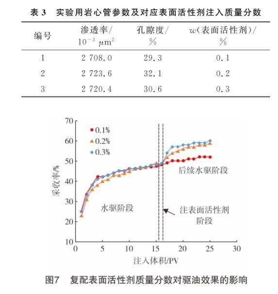 圖7為復(fù)配表面活性劑在模擬油藏條件下的巖心管(巖心管具體參數(shù)及對(duì)應(yīng)表面活性劑的注入質(zhì)量分?jǐn)?shù)見表3)驅(qū)油實(shí)驗(yàn)效果。由圖7可知,注入不同質(zhì)量分?jǐn)?shù)的復(fù)配表面活性劑后,后續(xù)水驅(qū)階段原油采收率均比前期水驅(qū)階段有所提高。當(dāng)表面活性劑質(zhì)量分?jǐn)?shù)分別為0.1%、0.2%和0.3%時(shí),采收率分別提高了5.8%、9.4%和10.3%。通過對(duì)比質(zhì)量分?jǐn)?shù)大小與采收率增幅發(fā)現(xiàn):當(dāng)表面活性劑質(zhì)量分?jǐn)?shù)由0.1%增至0.2%時(shí),采收率增加了3.6%;當(dāng)表面活性劑質(zhì)量分?jǐn)?shù)由0.2%增至0.3%時(shí),采收率僅增加了0.9%。因此,從成本角度考慮,建議將表面活性劑的使用質(zhì)量分?jǐn)?shù)控制在0.2%~0.3%。