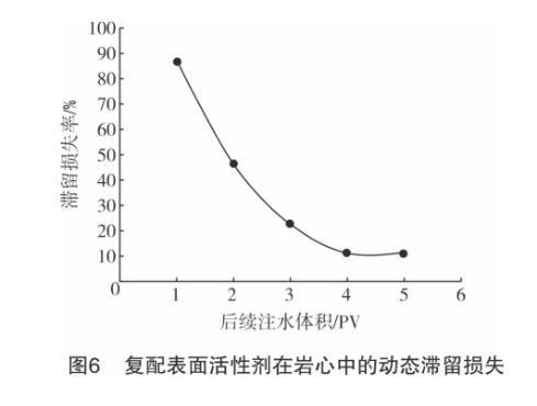 從圖6可知:隨著后續(xù)注水量的增加,表面活性劑在巖心中的滯留損失率呈下降趨勢(shì);當(dāng)后續(xù)注水量≥4 PV時(shí),滯留損失達(dá)到恒定;恒定時(shí)的滯留損失率較小,僅為11.2%。這一結(jié)果與復(fù)配表面活性劑和巖石壁面間的相互作用能有關(guān)。由于砂巖表面帶負(fù)電,而復(fù)配表面活性劑中十六烷基二甲基甜菜堿親水端同時(shí)含陰、陽(yáng)離子,烷基糖苷APG1214親水端為非離子,因此表面活性劑和巖石壁面間的相互作用能較大。相互作用能越大,吸附量越小,造成的滯留損失也就越小。
