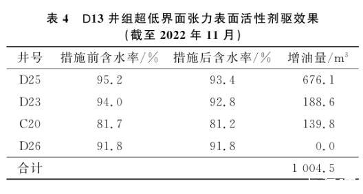 油藏評(píng)估結(jié)果顯示,D13井所控區(qū)域剩余可采儲(chǔ)量約6.7×104m3,剩余可采儲(chǔ)量較大。為挖掘該井所控區(qū)域油藏潛力,2022年4月開始對(duì)該井進(jìn)行超低界面張力表面活性劑驅(qū)油先導(dǎo)性試驗(yàn),2022年10月結(jié)束,共計(jì)注入表面活性劑溶液3 600 m3。考慮到滯留損失,試驗(yàn)將表面活性劑質(zhì)量分?jǐn)?shù)設(shè)計(jì)為0.3%。在注入過程中,注入壓力由8.9 MPa逐漸上升至10.2 MPa,分析認(rèn)為表面活性劑在地層中將剩余油乳化,乳化形成的油滴產(chǎn)生疊加的賈敏效應(yīng)所致。從表3的試驗(yàn)結(jié)果可知,截至2022年11月,施工結(jié)束1個(gè)月后,D13井對(duì)應(yīng)4口生產(chǎn)井中,除D26井因注采井距相對(duì)較遠(yuǎn),尚未見效外,其余3口井均已開始逐漸見效。見效井含水率下降0.5%~1.8%,1個(gè)月內(nèi)已實(shí)現(xiàn)在水驅(qū)基礎(chǔ)上增油1 004.5 m3,這說(shuō)明超低界面張力表面活性劑能實(shí)現(xiàn)剩余油的有效啟動(dòng)。