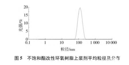 制備的不飽和酯改性環氧樹脂上漿劑乳液的性能測試結果見表5,粒徑及分布測試結果見圖5。