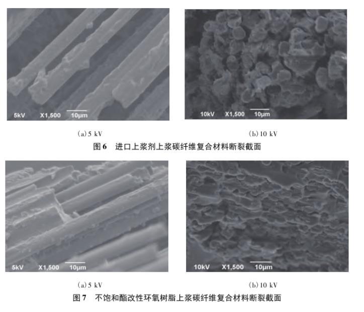 采用進口上漿劑和不飽和酯改性環氧樹脂上漿劑制備的上漿碳纖維復合材料斷裂截面見圖6~7。