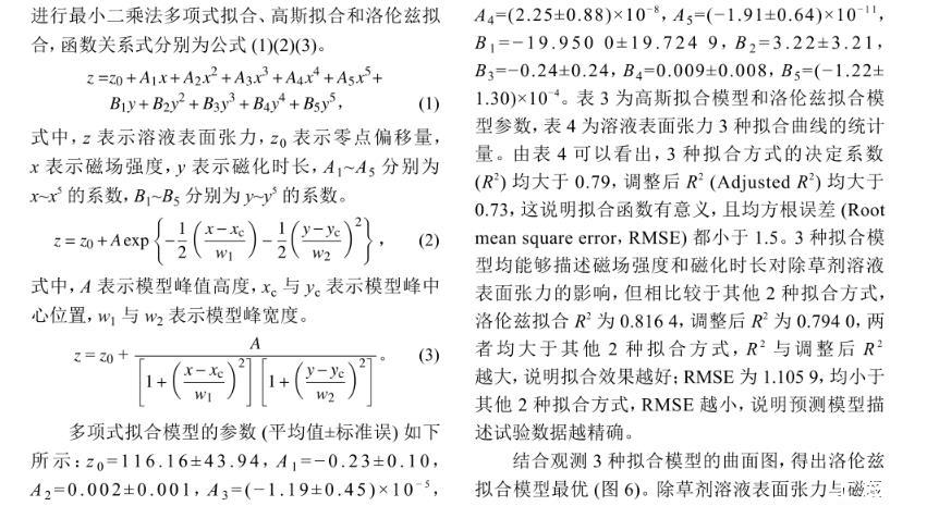 結合觀測3種擬合模型的曲面圖,得出洛倫茲擬合模型最優(圖6)。除草劑溶液表面張力與磁場強度和磁化時長的關系式見公式(4),為研究磁化作用對除草劑溶液表面張力的影響提供理論參考。