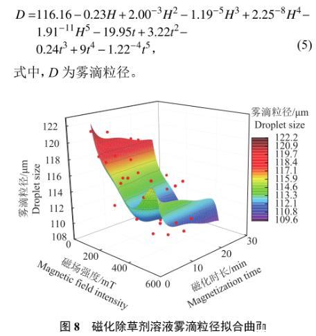 噴施壓力、噴頭型號、磁化溶液量等多種因素都可能對磁化效果產生影響,在后續研究中應盡可能建立有多影響因素參數的函數關系式;除此之外,磁化作用通過影響除草劑溶液表面張力而間接影響霧滴粒徑,可通過研究表面張力與霧滴粒徑關系模型來優化磁化作用與霧滴粒徑的函數關系式。