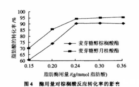 由圖4可見,在本實驗條件下,當酶的用量增加時,脂肪酸的反應轉化率增加。當酶的用量為0.24g/mmol脂肪酸時,催化效果最好,棕櫚酸及月桂酸的反應轉化率分別為達到90.6%和94.3%。