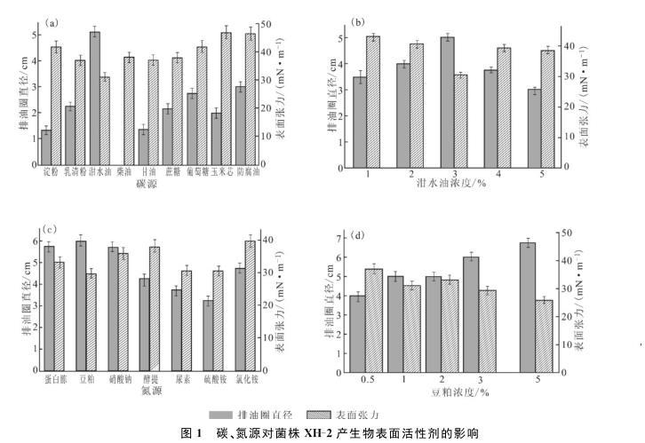 圖1碳、氮源對菌株XH-2產生物表面活性劑的影響