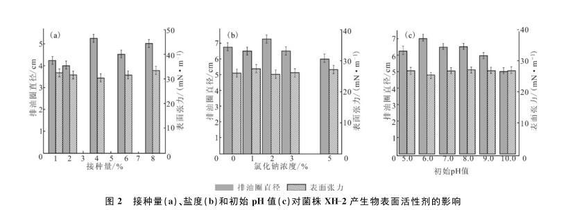 圖2接種量(a)、鹽度(b)和初始pH值(c)對菌株XH-2產生物表面活性劑的影響