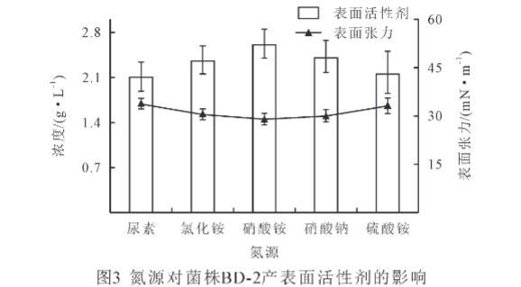 氮源在微生物生長和酶的合成中起著重要作用。由圖3可得,氮源種類對菌株BD-2產(chǎn)表面活性劑的影響存在顯著差異,以硝酸銨、硝酸鈉和氯化銨為氮源時,菌株BD-2產(chǎn)表面活性劑的量顯著高于尿素和硫酸銨(P<0.05),其產(chǎn)表面活性劑量大小依次為硝酸銨>硝酸鈉>氯化銨>硫酸銨>尿素;以硝酸銨、硝酸鈉和氯化銨為氮源時,菌株BD-2能顯著降低發(fā)酵液表面張力(P<0.05),表面張力大小依次為尿素>硫酸銨>氯化銨>硝酸鈉>硝酸銨。以硝酸銨為氮源時,表面活性劑量最高,為2.40 g/L,而表面張力最低,為29 mN/m。研究結果表明,硝酸銨有利于菌株BD-2產(chǎn)表面活性劑,而硝酸鈉和氯化銨效果不明顯,因此,選擇硝酸銨為菌株BD-2的最適氮源。