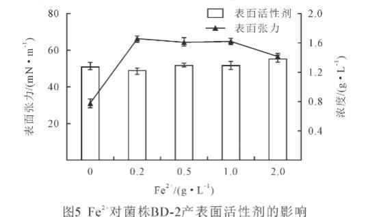 由圖5可知,當Fe2+濃度為0.2 g/L時,表面張力最大,可達66.4 mN/m,而表面活性劑量為1.22 g/L,當Fe2+濃度是CK時,表面張力最小,為30.9 mN/m,此時的表面活性劑量為1.27 g/L,而當Fe2+濃度為2 g/L時,表面活性劑量最大,為1.37 g/L,此時的表面張力為56.6 mN/m。分析可得,增加Fe2+后,菌株的表面張力明顯增加,表面活性劑量無顯著變化(P>0.05),F(xiàn)e2+對菌株BD-2產(chǎn)表面活性劑無促進作用。
