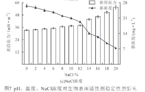 如圖7(c)所示,隨著NaCl濃度增加,萘濃度顯著下降(P<0.05),但NaCl濃度在8%以內,萘濃度均高于21 mg/L,表明生物表面活性劑對萘的增溶穩(wěn)定;而液體表面張力總體呈現(xiàn)上升的趨勢,其中,NaCl濃度12%以內,液體表面張力變化不顯著(P>0.05),說明菌株BD-2產(chǎn)的生物表面活性劑能夠在一定鹽度范圍內,較好地降低液面張力。