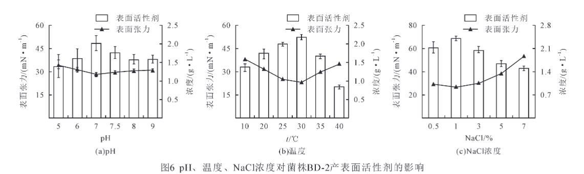 對菌株BD-2在不同的環(huán)境條件下進行了發(fā)酵實驗。如圖6(a)所示,pH在5~7之間,生物表面活性劑量明顯增加,在pH為7時,表面活性劑量最高,為1.64 g/L,而發(fā)酵液表面張力由34.3 N/m下降到28.2 mN/m。pH大于7后生物表面活性劑量顯著下降(P<0.05),表面活性劑量由2.01 g/L下降到1.57 g/L。pH為7后表面張力顯著上升(P<0.05),表面張力由28.2 mN/m升高到31.1 mN/m。研究結果表明,菌株BD-2在pH為7時生物表面活性劑量最多、表面張力最低,因此,菌株BD-2的最適發(fā)酵pH為7。