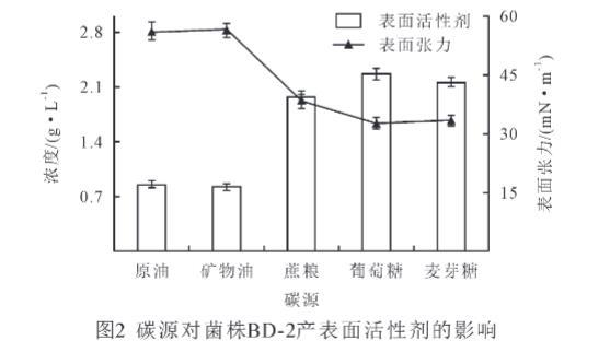 碳源對微生物的生長和次生代謝產(chǎn)物的產(chǎn)生有重要的影響。由圖2可知,不同碳源對菌株BD-2產(chǎn)表面活性劑量的影響不同,本實驗將原油、礦物油作為一類復雜碳源,葡萄糖、麥芽糖、蔗糖作為簡單碳源,進行對比分析發(fā)現(xiàn),以簡單碳源作為底物時,菌株BD-2產(chǎn)表面活性劑的量顯著高于復雜碳源(P<0.05),其產(chǎn)表面活性劑量大小依次為葡萄糖>麥芽糖>蔗糖>原油>礦物油。同時以簡單碳源為底物時,菌株BD-2能顯著降低發(fā)酵液表面張力(P<0.05),其發(fā)酵液表面張力大小依次為原油>礦物油>蔗糖>麥芽糖>葡萄糖。在簡單碳源中,以葡萄糖為碳源時,菌株BD-2產(chǎn)生的表面活性劑的量最高,為2.26 g/L,而表面張力最低,為32.7 mN/m。研究結果表明,簡單碳源有利于菌株BD-2產(chǎn)表面活性劑。因此,選擇葡萄糖為菌株BD-2的碳源。