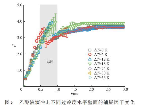 為了探究水平壁面過冷度對液滴沖擊的影響機制,定義無量綱鋪展因子β=D(t)/D0,其中D(t)為液滴每一時刻的直徑,Dmax為液滴能達到的最大鋪展直徑,對應的最大鋪展因子為βmax=Dmax/D0。圖5展示了不同水平壁面過冷度下,乙醇液滴沖擊水平壁面的鋪展因子β隨時間的變化曲線。可以看出,乙醇液滴沖擊不同過冷度水平壁面均在1.0ms內發生破碎-飛濺,在這段時間內,鋪展速率近似為線性,在飛濺后,β突然減小,隨后鋪展因子繼續增,鋪展速率逐漸減小,最終趨于0,液滴形態不再發生變化。