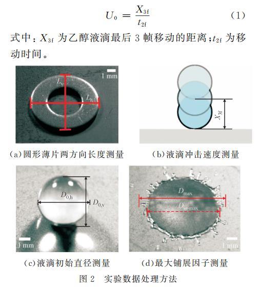 式中:X3f為乙醇液滴最后3幀移動的距離;t2f為移動時間。(a)圓形薄片兩方向長度測量(b)液滴沖擊速度測量(c)液滴初始直徑測量(d)最大鋪展因子測量圖2實驗數據處理方法