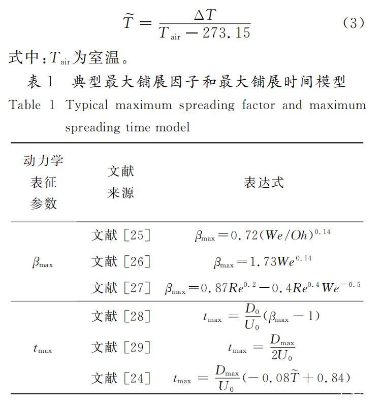如表1所示,Bayer和Megaridis認為液滴沖擊水平壁面的最大鋪展因子與韋伯?dāng)?shù)、奧內(nèi)佐格數(shù)有關(guān),并提出了相關(guān)關(guān)聯(lián)式。Roisman認為最大鋪展因子與雷諾數(shù)、韋伯?dāng)?shù)均有關(guān),他采用半假設(shè)半理論的方法,從動量守恒理論出發(fā),提出了最大鋪展因子的表達式。針對最大鋪展時間,Wildeman等認為,最大鋪展時間與最大鋪展因子有關(guān),結(jié)合實驗數(shù)據(jù),對最大鋪展時間進行了修正。Shang等探究了水滴沖擊過冷水平壁面的鋪展動力學(xué)行為,并將水平壁面過冷度引入最大鋪展時間模型,重新定義無量綱過冷溫度