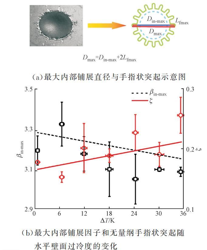 為了揭示βmax隨水平壁面過冷度的這一非單調(diào)變化,將βmax分為兩部分,并分別研究各部分與乙醇濃度的關(guān)系。如圖7(a)所示,βmax包含內(nèi)部鋪展無量綱直徑βin-max=Din-max/D0,以及邊緣的無量綱指狀長度ζ=LfmaxD0,其中Din-max為液滴鋪展到最大程度的內(nèi)部鋪展直徑,Lfmax為液滴鋪展至最大的指狀長度。當(dāng)ζ<0.15時,認為液滴不形成指狀突起,當(dāng)ζ≥0.15時,認為液滴形成指狀突起。
