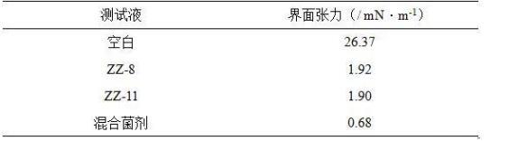 從表2實驗結果中可以看出與空白相比解淀粉芽孢桿菌(Bacillusamyloliquefaciens)ZZ-11、膠凍樣芽孢桿菌(Bacillus mucilaginosus)ZZ-8的界面活性好,油水界面低至1.92 mN/m和1.90mN/m,為低界面張力水平?;旌暇鷦┑慕缑婊钚愿鼮橥怀?,低至0.68mN/m。