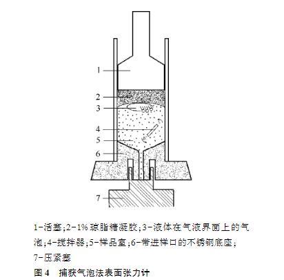 為了避免膜泄漏的出現(xiàn),Schürch等引入了一種防泄漏的捕獲氣泡法表面張力計(jì)。在捕獲氣泡法裝置中(見(jiàn)圖4),待測(cè)液體充滿樣品室,樣品室頂部鍍有一親水性瓊脂糖凝膠,從底部進(jìn)樣口引入的氣泡在浮力作用下上升并緊靠瓊脂糖凝膠層,同時(shí)氣泡和凝膠層之間由于液體樣品薄層的阻隔,故不會(huì)黏附于凝膠層之上。氣泡的體積通過(guò)改變樣品室中的壓力來(lái)控制。隨著氣泡體積減小,表面積減小,氣泡表面張力下降。氣泡形狀隨表面張力的變化而變化,從球形到橢圓形。對(duì)于初始直徑大于5mm氣泡,當(dāng)表面張力趨于0時(shí),氣泡呈薄圓盤(pán)狀。測(cè)量時(shí),通過(guò)推動(dòng)活塞改變樣品室的壓力來(lái)控制氣泡體積,并用視頻記錄氣泡體積變化。最后從視頻圖像中測(cè)得氣泡的高度和直徑,利用Malcolm等提出的方法計(jì)算氣液界面的表面張力、氣泡體積和表面積。