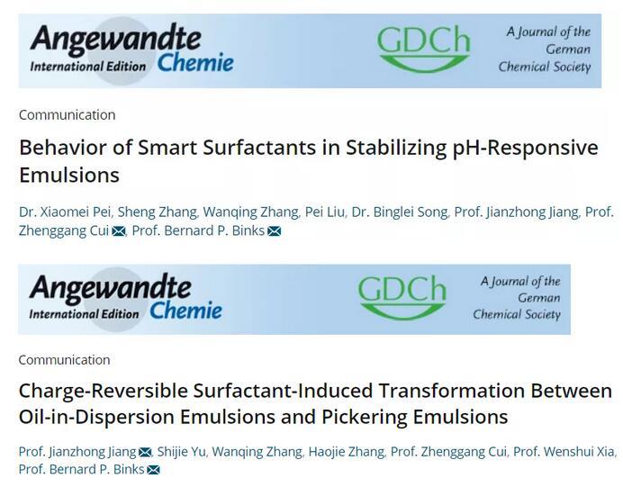 近期,江南大學(xué)蔣建中-崔正剛科研團(tuán)隊(duì)在新型智能表面活性劑設(shè)計(jì)開發(fā)領(lǐng)域取得突破性研究進(jìn)展,連續(xù)在Angew.Chem.Int.Ed.上發(fā)表2篇研究論文:“Behavior of smart surfactants in stabilizing pH-responsive emulsions,Angew.Chem.Int.Ed.2021,60,5235-5239(通訊作者崔正剛教授和B.P.Binks教授)”和“Charge-reversible surfactant-induced transformation between oil-in-dispersion emulsions and Pickering emulsions,Angew.Chem.Int.Ed.2021,60,11793-11798(通訊作者蔣建中教授和B.P.Binks教授)”。
