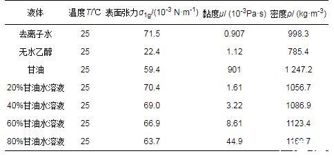 目前文獻(xiàn)中關(guān)于各類因素對液滴鋪展線速度和鋪展面積的影響,以及撞擊過程中液滴的表面能、動能和黏性耗散的變化的研究較少,因此本文采用實驗的方法研究了液滴的物性和操作條件對其撞擊固體表面過程中的鋪展直徑、鋪展速度和鋪展面積的影響,并結(jié)合能量法對表面能、動能和黏性耗散在撞擊過程中的變化進(jìn)行分析,以揭示液滴撞擊固體表面過程的特點。