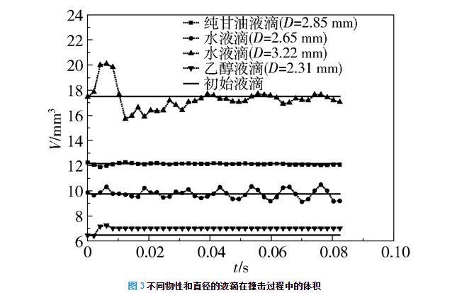 圖3不同物性和直徑的液滴在撞擊過程中的體積