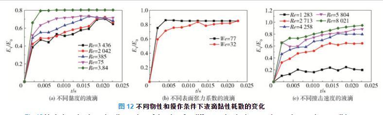 圖12(c)為液滴在不同撞擊速度下的黏性耗散情況。由圖5(b)可知,液滴的撞擊速度增加6.25倍時,液滴的最大鋪展線速度增加3.14倍,液滴內部的速度梯度增加,則根據式(22)可得液滴在撞擊過程中的黏性耗散率和黏性耗散速率均隨著撞擊速度的增大而增大。