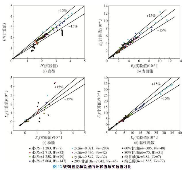 圖13為液滴直徑和能量的計算值與實驗值對比。可以看出,液滴直徑的計算值和實驗值的平均誤差約為15%(圖13(a)),液滴表面能的計算值和實驗值的平均誤差約為15%(圖13(b)),液滴動能的計算值和實驗值的誤差較大,最大誤差約為50%(圖13(c)),液滴黏性耗散的計算值和實驗值的誤差小于15%(圖13(d))。