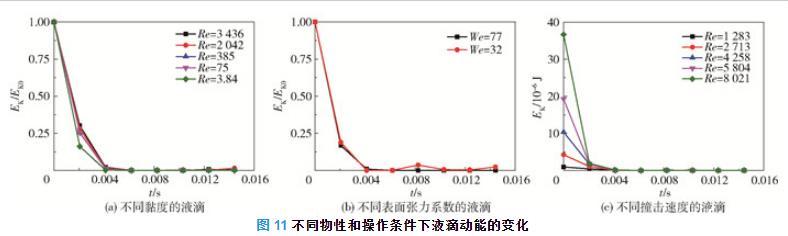 圖11(a)顯示出具有不同黏度的液滴的動能隨時間先減小后增大的一般趨勢。在撞擊的初始階段液滴動能減小的速率最大,隨著黏度的增加,液滴在鋪展過程中動能減小的速度加快,說明隨著液滴黏度的增大,有更多的動能耗散在黏性中。