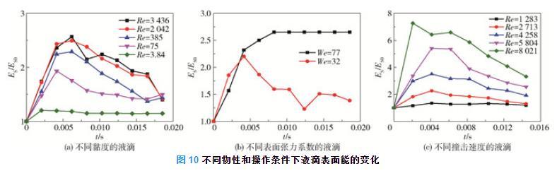 圖10為不同物性和操作條件下液滴表面能的變化。由圖4(a)、圖7(a)和式(19)均可得到液滴鋪展直徑和鋪展面積隨時間先增大后減小的一般規律,且隨著黏度的增加,液滴的鋪展直徑和鋪展面積均減小,液滴表面能增加的速率也在降低。