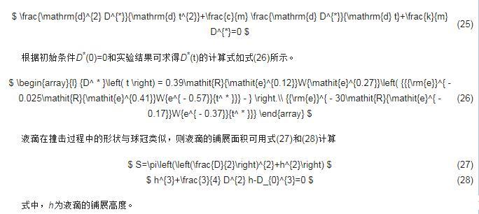 (2)在75 < Re < 9000,7 < We < 300時,可使用關系式Dmax*=We14和Smax*=0.203Re0.064We0.43分別預測液滴的最大鋪展直徑和最大鋪展面積。