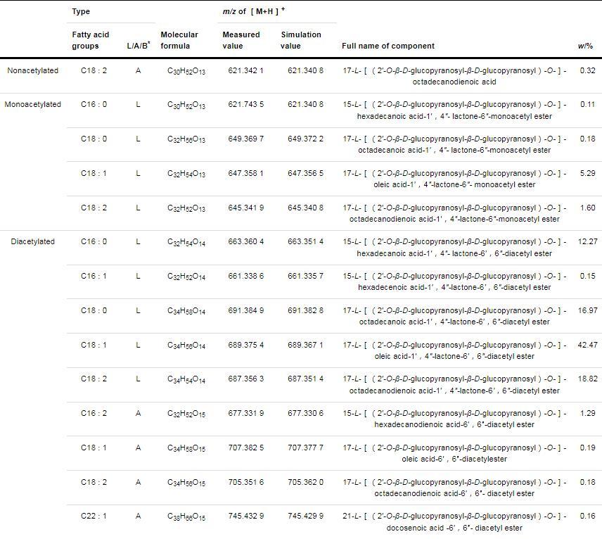 在去乙?;疭Ls同系物的總離子流圖中,保留時間為20.3 min的峰具有最高的豐度,達到16.96%,所對應的質譜碎片如圖2B所示,其中,m/z 597.5090為[M+H]+峰,m/z 619.4906為[M+Na]+峰,該組分與保留時間為9.4 min的組分具有相同的[M+Na]+和[M+H]+峰(圖2C),推測這2種組分可能為同分異構體;對于保留時間為9.4 min的質譜圖(圖2C),其中,m/z 619.3302和597.3479分別為[M+Na]+峰和[M+H]+峰,而m/z 435.2949和273.2423分別是[M+H]+失去1個和2個去乙?;募禾黔h(C6H10O5)形成的,m/z 273.2423(C16H33O3)是質子化的C16∶0羥基脂肪酸。上述分析表明,保留時間20.3和9.4 min的組分分別為ω型和ω-1型C16∶0的去乙酰化酸型SLs,即16-L-[(2'-O-β-D-吡喃葡萄糖基-β-D-吡喃葡萄糖基)-O-]-十六酸和15-L-[(2'-O-β-D-吡喃葡萄糖基-β-D-吡喃葡萄糖基)-O-]-十六酸。