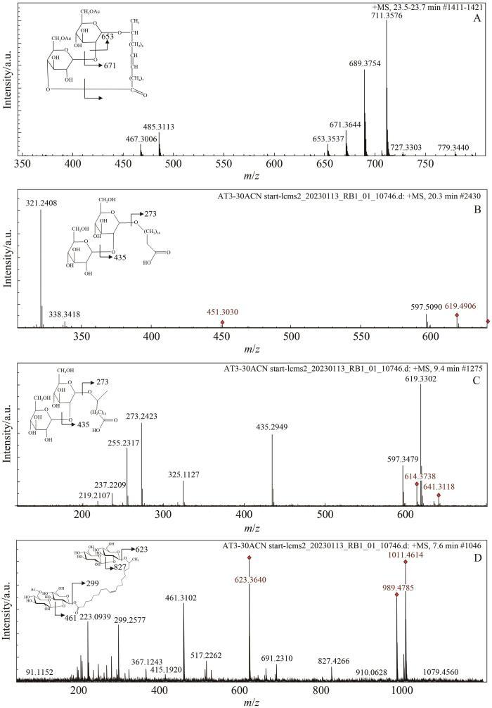 圖2(A)乙酰化SLs保留時間為23.6 min組分的質譜圖.(B)去乙酰化SLs保留時間為20.3 min組分的質譜圖.(C)去乙?;疭Ls保留時間為9.4 min組分的質譜圖.(D)去乙酰化SLs保留時間為7.6 min組分的質譜圖