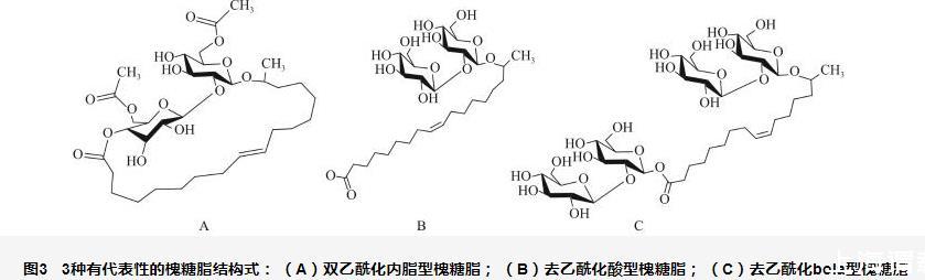 圖3 3種有代表性的槐糖脂結構式:(A)雙乙?;瘍戎突碧侵唬˙)去乙?;嵝突碧侵唬–)去乙?;痓ola型槐糖脂