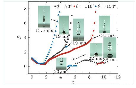 不論接觸角大小如何改變,液滴在場強較大情況下與下極板接觸后,電荷分布到液滴表面,使得液滴頂部出現拉伸及噴射現象。圖10為液滴的拉伸系數與接觸角的關系。從圖中可以看出,液滴撞擊三種不同表面后,其運動形態具有相似性,主液滴(與表面接觸的液滴部分)的拉伸系數均隨著無量綱時間不斷增加,當噴射達到一定時間后會有部分液滴分離,主液滴拉伸系數驟降,隨后振蕩最終趨于穩定。