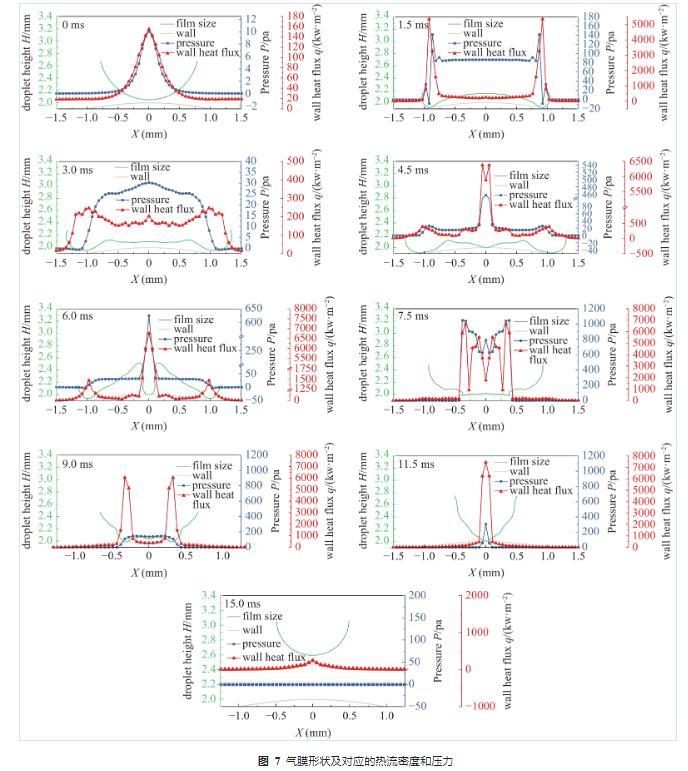 圖7展示了不同球面位置處氣膜厚度、壁面壓力及熱流密度,從圖中可以看出壁面熱流密度及壓力與氣膜厚度的對應關系。當t=0.0 ms時,液滴即將撞擊球面,此時中心點氣膜厚度最薄,對應的壁面位置壓力與熱流密度都高于其它位置;t=1.5 ms時,液滴向四周鋪展,在距液滴中心大約1 mm處氣膜厚度達到最低,可以看出熱流密度與壓力都在此處發生驟增,在距離液滴中心更近的位置又因氣膜厚度增大而驟減,顯然壓力與熱流密度都與氣膜厚度成反比;t=3.0 ms時,液滴繼續鋪展,邊緣處氣膜厚度升高,熱流密度與壓力都在降低,而邊緣至中心位置氣膜厚度降低,熱流密度略有升高,但氣膜厚度波動較大,因此熱流密度與壓力也出現了不同程度的波動;t=4.5 ms時,液滴鋪展達到最大,中心位置與邊緣處氣膜厚度都在減小,中心位置氣膜厚度更小,此處熱流密度與壓力增幅更大;t=6.0 ms時,液滴開始彈跳,中心及邊緣處所受壓力增加;t=7.5 ms時,中心位置氣膜厚度較低且波動較大,因此中心位置壓力及熱流密度都發生了振蕩,變化幅度較大;t=9.0 ms-15.0 ms時段,液滴逐漸脫離熱壁面,氣膜厚度發生變化,壓力與熱流也隨之變化,直到液滴脫離壁面。
