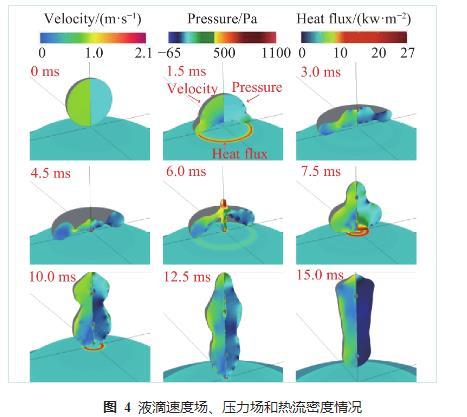 圖4液滴速度場、壓力場和熱流密度情況