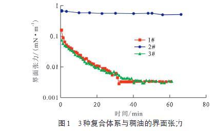 在比較3種復(fù)合體系驅(qū)油特征之前,應(yīng)確定其能否滿足超低界面張力和良好乳化性能的基本設(shè)計(jì)要求。因此,首先針對(duì)選用的復(fù)合體系,測(cè)試其與稠油的界面張力(圖1)。1#超低界面張力復(fù)合體系和3#雙效復(fù)合體系與稠油的界面張力均能達(dá)到超低水平,為3.0×10-3mN/m;而2#乳化復(fù)合體系與稠油的界面張力為5.1×10-1mN/m。3種復(fù)合體系與稠油的界面張力表現(xiàn)出顯著的不同,符合進(jìn)一步驅(qū)油對(duì)比的需要。此外,盡管超低界面張力有利于減小毛細(xì)管力和稠油在巖石壁面的黏附功,但是對(duì)于稠油復(fù)合驅(qū),乳化降黏機(jī)理極為關(guān)鍵,需進(jìn)一步對(duì)3種復(fù)合體系的乳化性能加以研究。