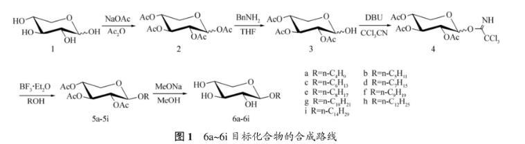 采用全乙酰化的木糖(2)在四氯化錫催化下與一系列脂肪醇發生偶聯反應,對時間要嚴格控制,否則有部分轉化成α-異構體,當時間過長時,還會形成以α-糖苷為主的產物和少量2-位脫保護的糖苷副產物。參考烷基-β-D-葡萄糖苷等合成與性能研究成果,按照Scheme1所示的路線,以D-木糖(1)為原料通過乙酰化、脫1-位乙酰基、與三氯乙腈反應,得到相應的三氯乙酰亞胺酯(4)。采用易于構筑1,2-反式糖苷鍵的三氯乙酰亞胺酯法,以三氟化硼乙醚作糖苷化偶聯反應的催化劑,使得具有鄰基參與效應的三氯乙酰亞胺酯(4)與相應的脂肪醇反應及相應的脫乙酰基保護,合成一系列烷基-β-D-吡喃木糖苷,如圖1所示。本文作者對其溶解性、表面張力、乳化性能、液晶性能、熱穩定性等理化性質進行研究。