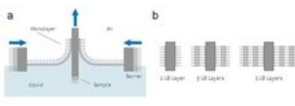 位于氣-液或液-液界面處不可溶的功能性分子、納米顆粒、納米線或微粒所形成的單分子層可定義為Langmuir膜。這些分子能夠在界面處自由移動,具有較強的流動性,易于控制其堆積密度,研究單分子層的行為。將材料沉積在淺池(稱頂槽)中的水亞相上,可以得到Langmuir膜。在滑障的作用下,單分子層可以被壓縮。表面壓力即堆積密度可以通過Langmuir膜分析儀的壓力傳感器進行控制 。