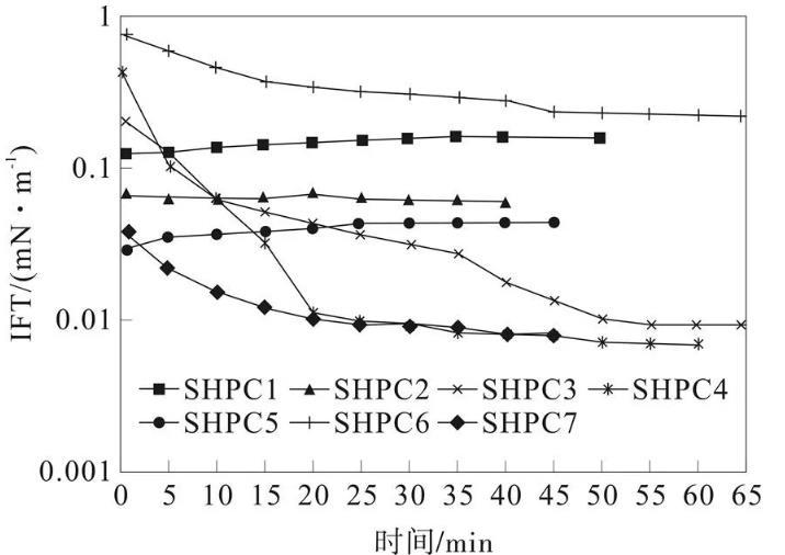 將SHPC1~7活性體系溶液配制為濃度大小為0.25%的溶液,密閉24 h,然后利用Texas-500C界面張力儀對界面張力進行動態測定,從而得到圖2所示的結果。