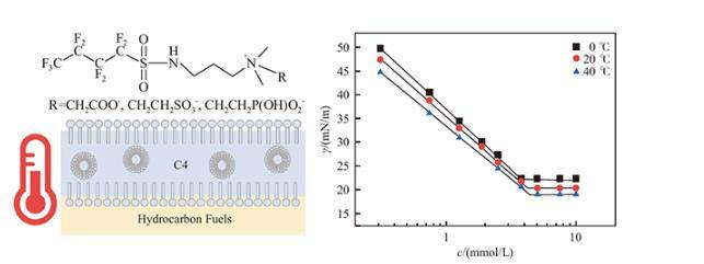 然而不同溫度對(duì)表面活性劑的性能可能有一定程度的影響。尤其是機(jī)場消防領(lǐng)域,由于我國機(jī)場分布較廣,消防車滅火需要就近取水,各機(jī)場在冬季和夏季的消防用水水源溫度差異較大(一般在0~40℃)。在低溫下氟碳表面活性劑的性能可能會(huì)受到影響,進(jìn)而影響AFFF的滅火性能。我國國標(biāo)中也僅對(duì)泡沫在室溫下的性能指標(biāo)有所要求,并未嚴(yán)格考慮溫度的影響。因此,將溫度作為影響因素進(jìn)行研究,能夠指導(dǎo)表面活性劑的有效應(yīng)用。本文在溫度為0~40℃的范圍下,研究三種接枝不同親水基團(tuán)的基于短碳氟鏈的甜菜堿型兩性氟表面活性劑的一系列理化性質(zhì),為此類表面活性劑在不同溫度環(huán)境下的應(yīng)用提供理論依據(jù)。