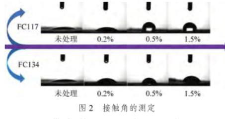 由表2可知,隨著FC117和FC134兩種表面活性劑溶液濃度的增加,溶液的表面張力先迅速降低,再逐漸趨于穩定。當表面活性劑濃度從0增加至0.2%時,表面張力從初始的73 mN/m分別降至23.124 mN/m和19.07 mN/m,表面張力大幅度地降低;當表面活性劑濃度從0.2%增加至1.5%時,表面張力變化幅度較小,保持著較小程度的降低,并趨于穩定。