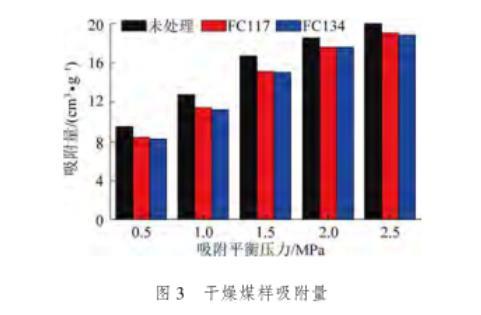 由圖3可知,隨著甲烷吸附平衡壓力的增加,氣潤濕反轉劑處理前后煤樣的吸附量均逐漸增加,且增加量均呈現逐漸減小趨勢。經過氣潤濕反轉劑FC117和FC134處理后的煤樣吸附量始終小于未處理的煤樣。其中,產生該現象的原因主要為:一方面,氣潤濕反轉劑分子自身占有一定的體積,隨水溶液一同進入煤體內部。在干燥過程中,水分通過蒸發作用排出煤體,而氣潤濕反轉劑分子則滯留在煤體內部,進而減小甲烷分子的吸附空間;另一方面,氣潤濕反轉劑具有低表面張力的特性,在吸附在煤體內部孔隙裂隙的表面,降低其表面自由能,減小對甲烷分子的吸附能力,進而使得吸附量下降。